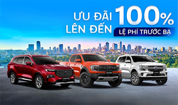 Tất cả các khách hàng mua xe đã hoàn tất thủ tục thanh toán 100% và xuất hóa đơn VAT từ ngày 01/07/2025 đến hết 31/07/2025 đối với các dòng xe Territory, Ranger Sport và Ranger Wildtrak sẽ được ưu đãi giảm giá tương đương 100% lệ phí trước bạ.