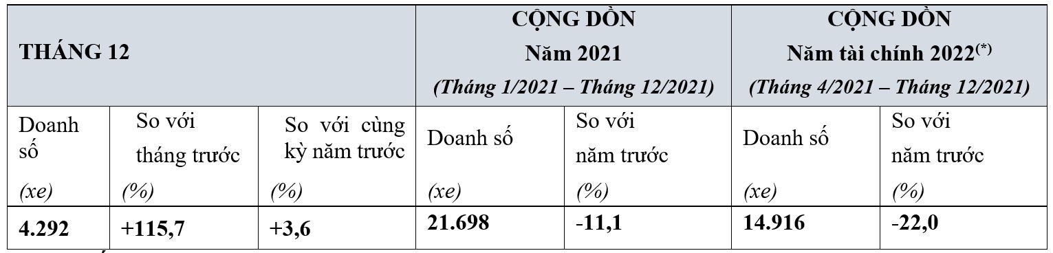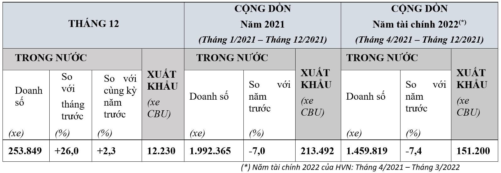 Tháng 12/2021 doanh số ô tô Honda đạt mức kỷ lục với 4.292 xe, tăng 115,7% so với tháng trước và tăng 3,6% so với cùng kỳ năm ngoái. Mẫu xe bán tốt nhất tháng 12: City với 2.088 xe bán ra, chiếm 48,6% tổng doanh số bán ô tô của HVN trong T12/2021.