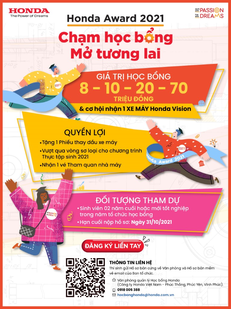 - Tiếp tục hợp tác với Viện Chiến lược Chính sách Khoa học và Công nghệ (NISTPASS) và Bộ Giáo dục và Đào tạo tổ chức Học bổng Honda (Honda Award) – khởi động vào tháng 9/2021. Năm nay, Học bổng dành cho sinh viên 2 năm cuối hoặc mới tốt nghiệp trong năm 2020 của 18 trường Đại học thuộc khối khoa học, công nghệ, kĩ thuật và các khối ngành nghề khác như kinh tế, tài chính, luật, marketing, ngoại ngữ…