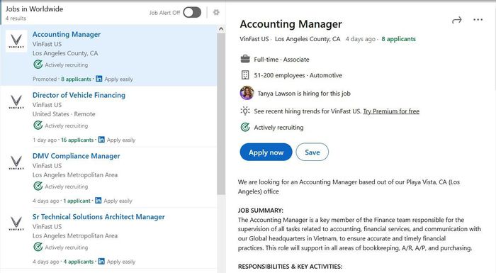 Ngoài ra, trang LinkedIn chính thức của VinFast Mỹ cũng đăng thông tin tuyển dụng nhiều vị trí trong những ngày gần đây như kế toán trưởng, giám đốc phụ trách chính sách giá ôtô.