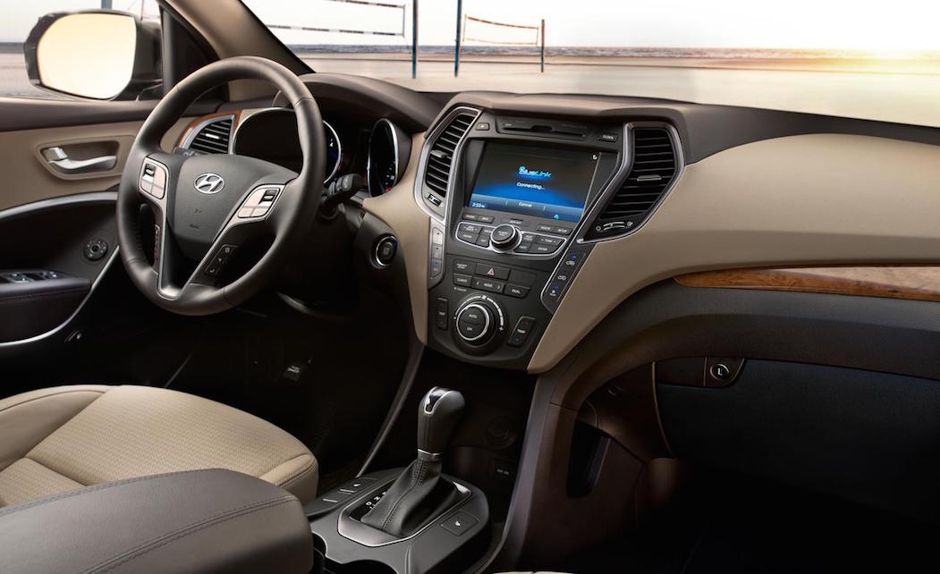 Khoang lái của Santa Fe ngập tràn công nghệ và những tính năng không kém gì những mẫu xe hạng sang, có thể kể tới gồm: hệ thống giao diện đèn chào/ âm thanh khi người lái vừa bước vào xe; phanh tay điện tử; ba chế độ lái kèm tác động nặng/ nhẹ vào vô lăng; cốp điện mở từ xa; khởi động nút bấm; cửa sổ trời Panorama; hệ thống thông tin giải trí với màn hình cảm ứng LCD 8 inch, đầu DVD và phần mềm định vị Sygic tiếng Việt; chế độ lái xe tiết kiệm nhiên liệu (ECO)…