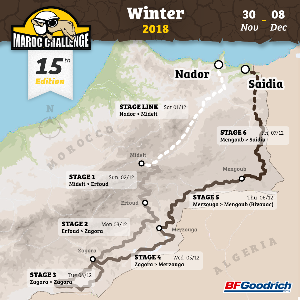 Hành trình Mùa đông 2018 sẽ diễn ra từ ngày 30/ 11 đến ngày 8/12 với điểm lái thử bắt đầu từ thành phố Midelt Ma-rốc và sau đó đến Erfoud, Zagora, Merzouga và Mengoub. Đích đến sẽ là Khu du lịch Saidia bên bờ biển Địa Trung Hải lộng gió và đầy thơ mộng. Hành trình sẽ chính thức khởi đầu từ Erfoud như những năm trước đây. Sau đó, các đội tham dự sẽ được trải nghiệm khung cảnh tuyệt vời của sa mạc, phiêu lưu qua những thị trấn xinh đẹp ở phía nam, băng qua Erg Chegaga – một trong những sa mạc lớn nhất tại miền Nam Ma-rốc với những cồn cát cao tới 300 mét. Sau khi vượt qua Tigri chott, đến gần với biên giới Algeria bên bờ biển Địa Trung Hải và sẽ kết thúc bằng bữa tiệc thịnh soạn tại Saidia./