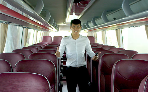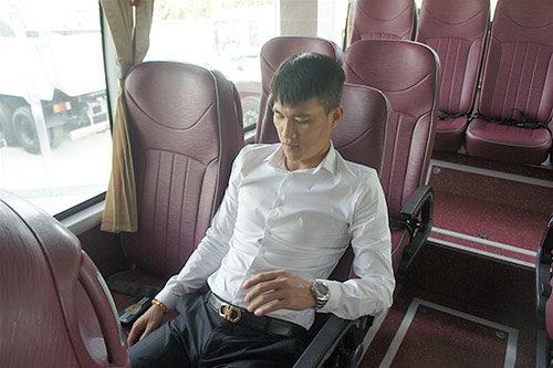 Công Vinh bên trong chiếc xe với nội thất không khác biệt nhiều so với những chiếc xe khách đường dài chất lượng cao