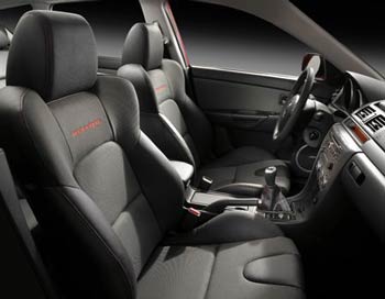 Nội thất Mazdaspeed3 toát lên vẻ thể thao lịch lãm. Đường chỉ đỏ khâu nổi trên nắm tay cần số tương phản hài hòa với vô lăng bọc da đen, ghế nêm thể thao ôm có tấm lót và bàn đạp mạ nhôm nam tính.