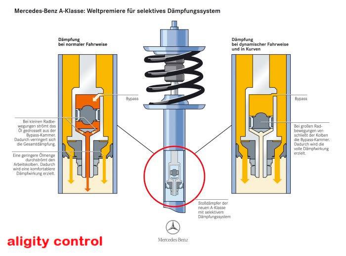 Gần tương đồng với khả năng thay đổi độ cứng của giảm xóc điều khiển điện. Nhưng Aligity control được cấu tạo dựa trên sự linh hoạt cảu giảm xóc. Với hệ thống này, chỉ có 2 van được trang bị, 1 van luôn mở, còn van còn lại có khả năng thu hẹp kích thước hoặc đóng hẳn lại. Đặc biệt ở chỗ, van này không điều khiển bằng điện mà bằng phép đo xung lực từ mặt đường lên khung xe, tạo ra một hệ thống giảm xóc biến thiên hoàn toàn tự động.