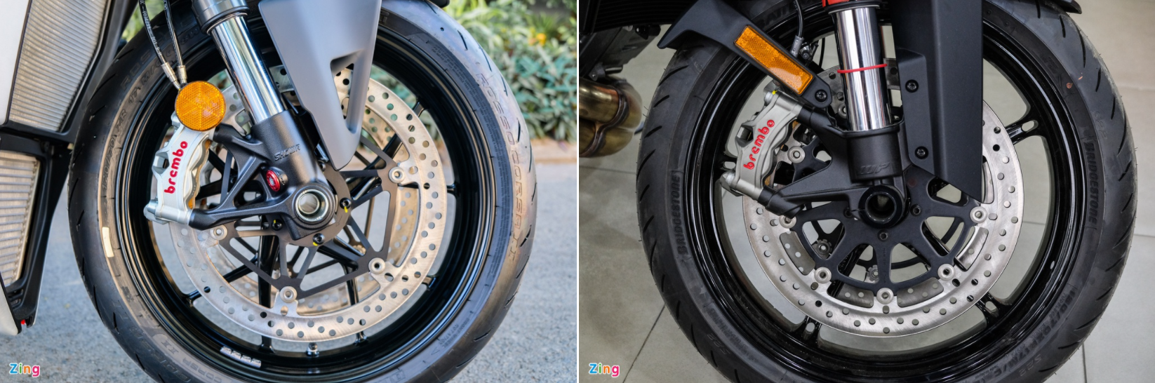 KTM 1290 Super Duke R và Ducati Streetfighter V4 khá tương đồng về trang bị. Cả 2 mẫu xe đều sử dụng kẹp phanh Brembo M50 Stylema ở phía trước và kẹp phanh 2 piston của Brembo ở phía sau.