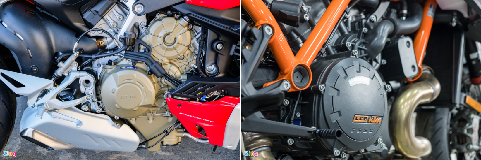 Ducati Streetfighter V4 được trang bị khối động cơ Desmosedici Stradale, dung tích 1.103 cc chia sẻ từ Panigale V4. Trong khi đó, 1290 Super Duke R sử dụng động cơ LC8, dung tích 1.301 cc.