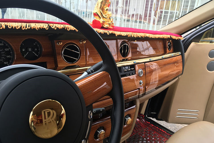 Tiến vào bên trong khoang lái, những người thợ Việt còn khéo léo khắc hoạ hình ảnh "quyền uy" Rồng xuất hiện ở bảng táp-lô, đây cũng là dấu hiệu nhận biết của Rolls-Royce Phantom bản tiêu chuẩn so với Phantom Year of the Dragon - vốn chỉ được sản xuất giới hạn. Các chi tiết khác cũng được chủ nhân cũ mạ vàng đầy sang cảnh.