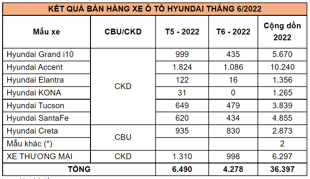 Doanh số bán hàng các mẫu xe Hyundai trong tháng 6/2022 (Đơn vị: Xe)