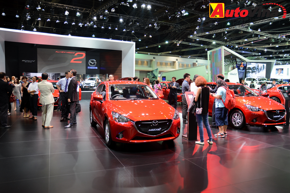Tại gian hàng Mazda là sự xuất hiện của dàn xe Mazda2 2015 hoàn toàn mới (còn gọi là Demio) với ngoại hình thiết kế theo ngôn ngữ Kodo quyến rũ, có đủ cả 2 phiên bản hatchback lẫn sedan. Đặc biệt là tất cả đều khoác trên mình bộ cánh đỏ tươi bắt mắt.