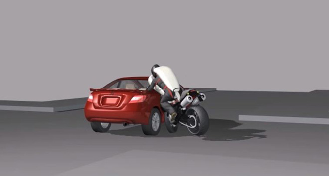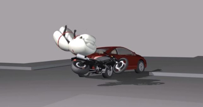 Được thể hiện dưới dạng video 3D mô phỏng tình huống tai nạn giao thông xảy ra giữa xe mô tô và ô tô. Về nguyên tắc, túi khí sẽ chỉ hoạt động khi xe di chuyển ở một tốc độ nhất định, các cảm biến trên xe ví dụ như cảm biến con quay hồi chuyển hoặc hệ thống đo lường quán tính IMU về tốc độ, lực va chạm, góc nghiêng của xe. Các túi khí sẽ được cài đặt bên dưới chỗ ngồi, khi điều khiển xe người lái sẽ cần phải thắt dây an toàn. Khi bị văng ra khỏi xe, chỉ trong vài giây túi khí sẽ phồng lên từ ghế ngồi và che chở toàn thân người lái, giống như kiểu “bánh mỳ bọc xúc xích” thường thấy.