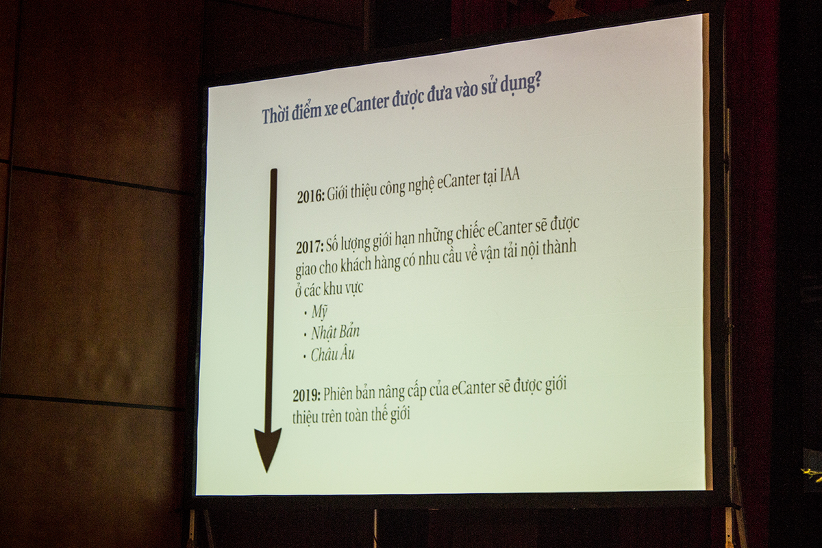 Trong Hội thảo “Xu hướng ứng dụng một số công nghệ thân thiện môi trường trong ngành ô tô” diễn ra vào sáng ngày 06/10/2016 trong khuôn khổ Triển lãm Vietnam Motor Show 2016, đại diện bên phía thương hiệu xe thương mại và chuyên dụng FUSO đã chia sẻ, năm 2019 có thể những chiếc xe tải hạng nhẹ chạy điện hoàn toàn eCanter sẽ được phân phối tại Việt Nam.