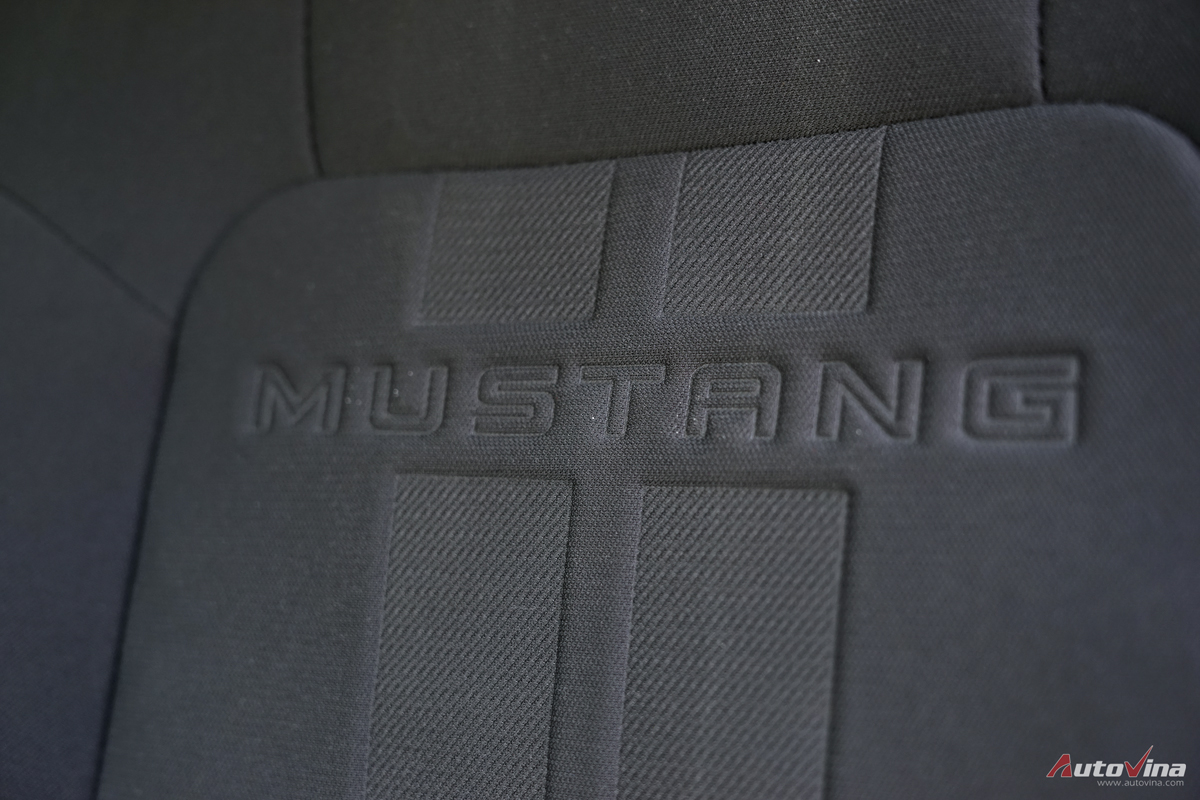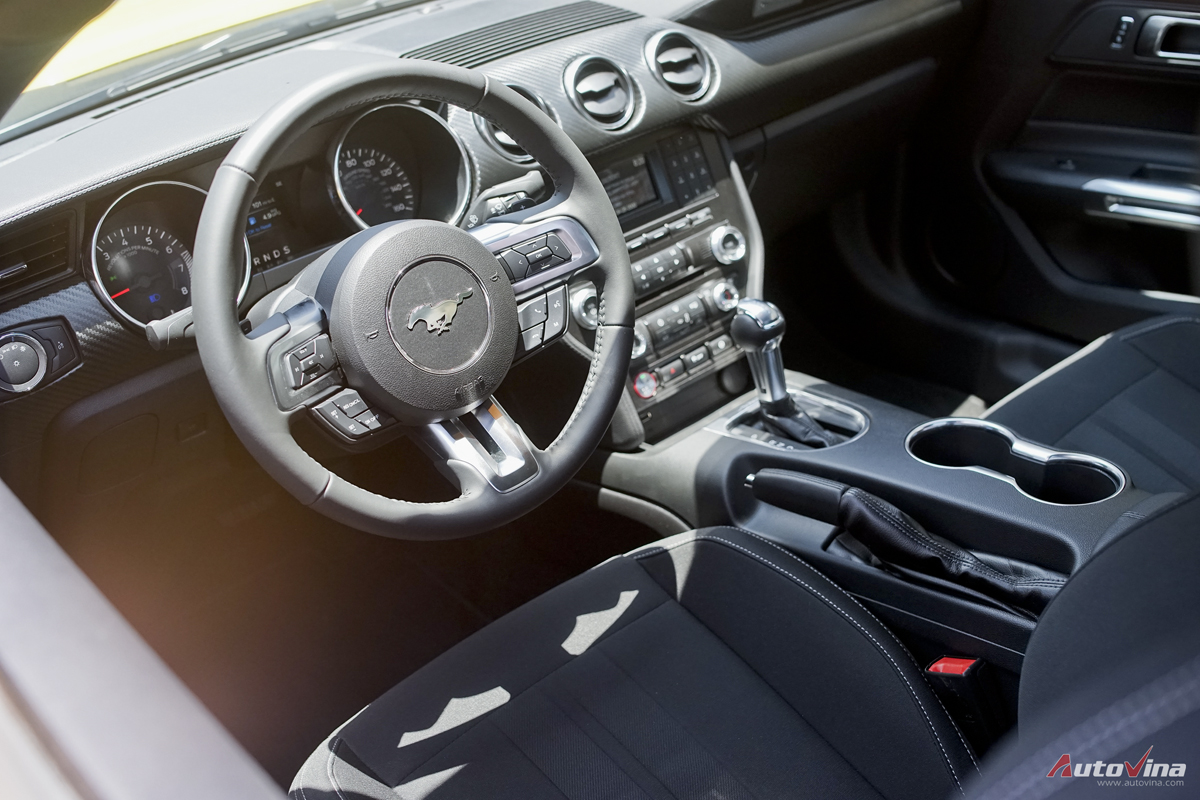 Nội thất xe đậm chất nam tính, cho cảm giác mạnh mẽ với kiểu thiết kế to bản, thực dụng với những đường thẳng tạo khối vuông đặc trưng dòng xe cơ bắp Mỹ. Ghế ngồi bọc nỉ, chỉnh cơ, vô lăng 3 chấu bọc da. Trên vô lăng được tích hợp nhiều nút bấm điều chỉnh màn hình thông tin, hệ thống giải trí, kiểm soát hành trình cruise control hay đàm thoại rảnh tay. Là một chiếc coupe 2+2, Ford Mustang thật sự chỉ thoải mái khi ngồi hai người. Hàng ghế sau của xe khá chật, vốn phù hợp với trẻ em.